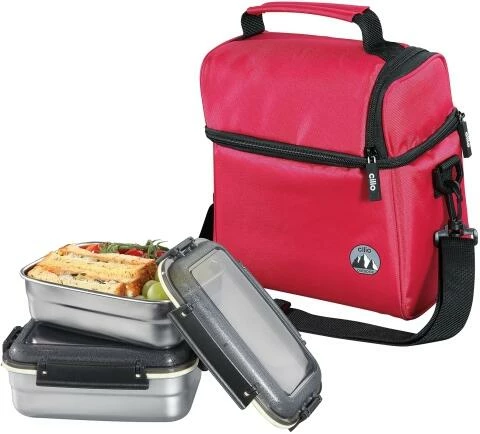 cilio Isoliertasche ROCCA in rot. Die ideale Tragetasche inkl. 2 Lunchboxen aus rostfreiem Edelstahl und auslaufsicherem Deckel.