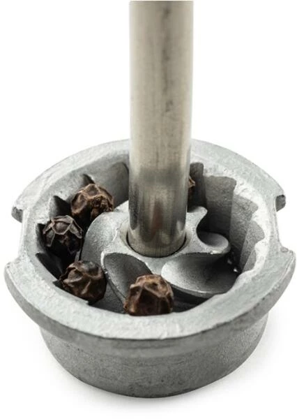 Die Zähne des Pfeffermahlwerkes von PEUGEOT werden mit einem Werkzeugstahl herausgearbeitet, daher die unübertreffliche Schärfe der PEUGEOT Pfeffermühlen. Es schneidet Pfefferkörner statt sie zu zerquetschen und setzt so die feinen Aromen, die die Pfefferkörner in sich bergen, schonend frei. Die gegenläufig, trichterförmig angeordneten Zähne ziehen den Pfeffer nach unten und mahlen, je nach Bedarf, fein oder grob. Der Mühlenkopf der Pfeffer- wie auch der Salzmühle trägt einen Knopf, mit dem sich der Mahlgrad einstellen lässt: von sehr fein bis extra grob. Je fester er angezogen wird, umso feiner ist das Mahlgut. Der Stahl des PEUGEOT Mahlwerks ist gegen Korrosion behandelt. Dies erhält die Schneidfähigkeit und garantiert eine lange Haltbarkeit der PEUGEOT Mühlen.