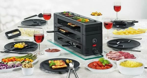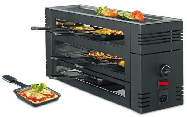 Raclette6 in schwarz. In wenigen Minuten können Sie mit dem Pizza Raclette 6 knusprige Pizzen für bis zu 6 Personen backen.